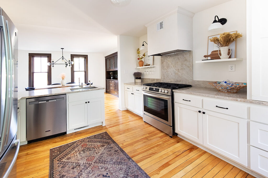 1. Text: Make the kitchen in picture one in the same style as the traditional kitchen in picture two. Keep the same layout, appliances, countertops, flooring and light fixtures. Remove the rug.