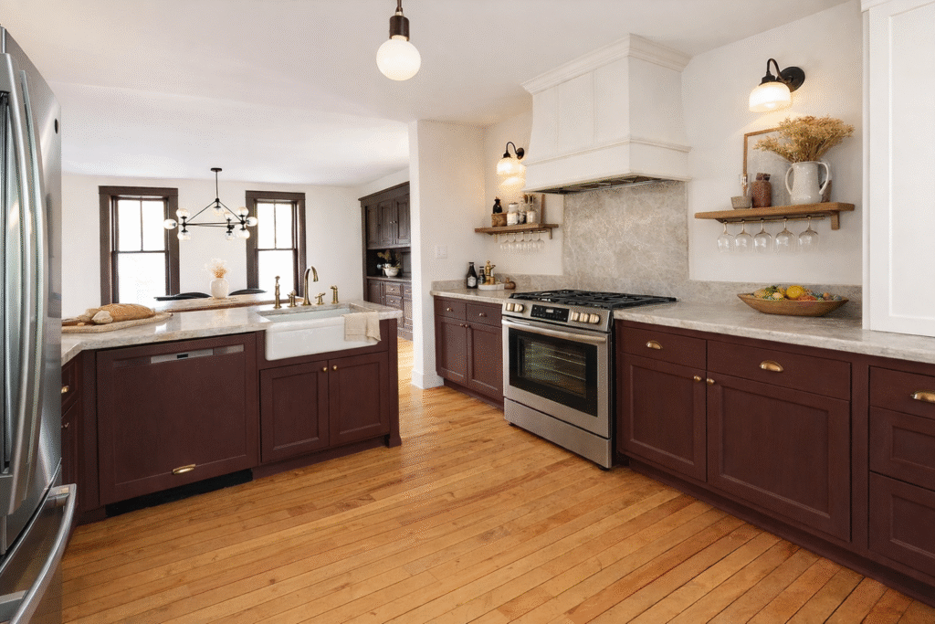 The kitchen style is fine as-is, but the cabinets only have one or two coats of Benjamin Moore Advance paint and are chipping in areas and need another few coats of paint (lesson learned, more is more). Since I’m painting them anyways, may as well change the color! After scouring my Pinterest for kitchens with wood floors and taj mahal counters, I decided that a deep burgundy would be the way to go. Here are the inputs I entered into ChatGPT to get from my current kitchen to my design-inspired kitchen (inspiration in the upper left):